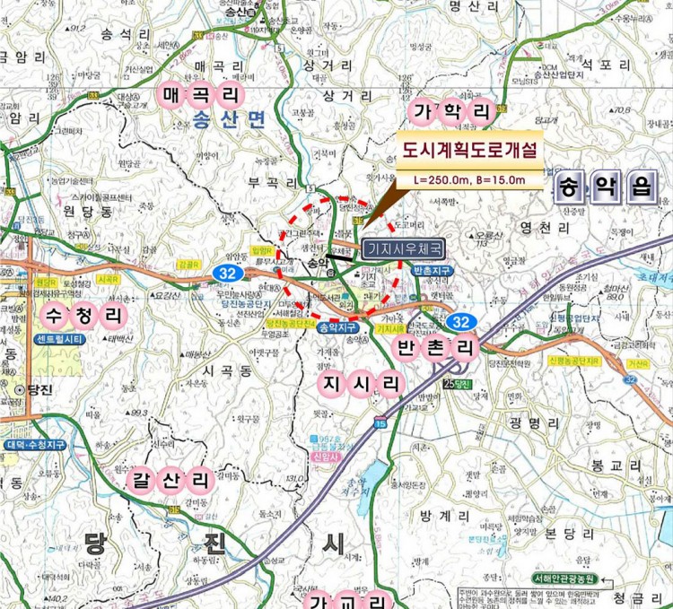 송악도시계획도로(우체국-외곽도로)개설공사 위치충청남도 당진시 송악읍 기지시리 일원 기간2017.05.10 ~ 2018.06.30 연면적공사연장 : 0.250km, 도로폭원 : B=15.0m 발주처충청남도 당진시 GO TO LIST